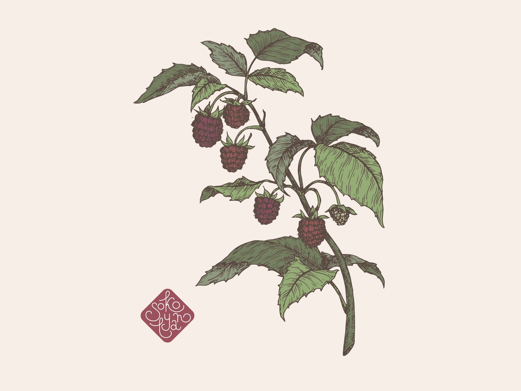 Red raspberry aka Rubus idaeus branch color sketch. Berry fruits series. Great for traditional medicine, perfume design, cooking or gardening.